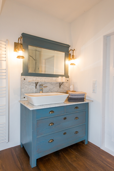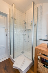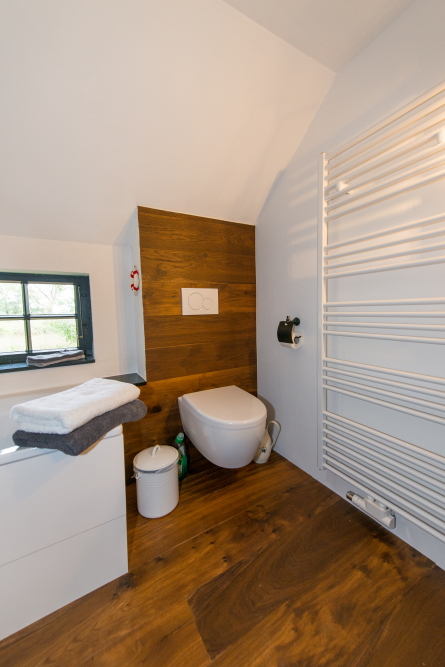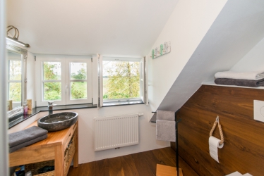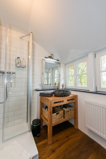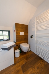 Im Dachgeschoss befindet sich ein kleines Duschbad mit einer tollen Aussicht über die Wesermarsch. Es ist ausgestattet mit Duschgel, Föhn, Kosmetiktücher und Toilettenpapier für die ersten Tage. Pro Person liegen für Sie ausreichend Handtücher sowie ein Bademantel für jeden bereit.
