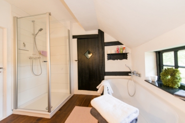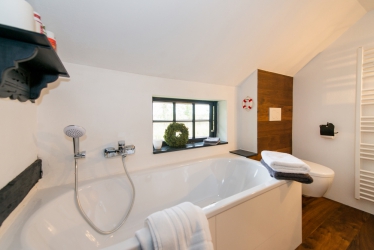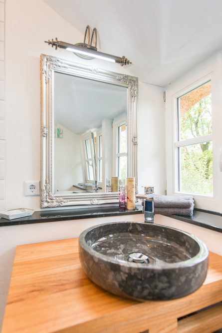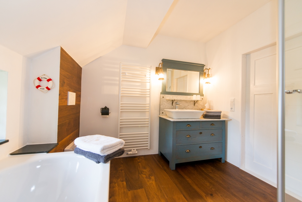 Im Erdgeschoss haben wir für Sie ein Wannenbad eingerichtet. Hier können Sie sowohl duschen, als auch ein Vollbad mit einer tollen Aussicht in die Moorlandschaft genießen. Die notwendigen Utensilien wie Badezusätze, Duschgel, Föhn etc. stellen wir Ihnen zur Verfügung. Pro Person erhalten Sie ausreichend Handtücher sowohl einen Bademantel pro Person bereit.